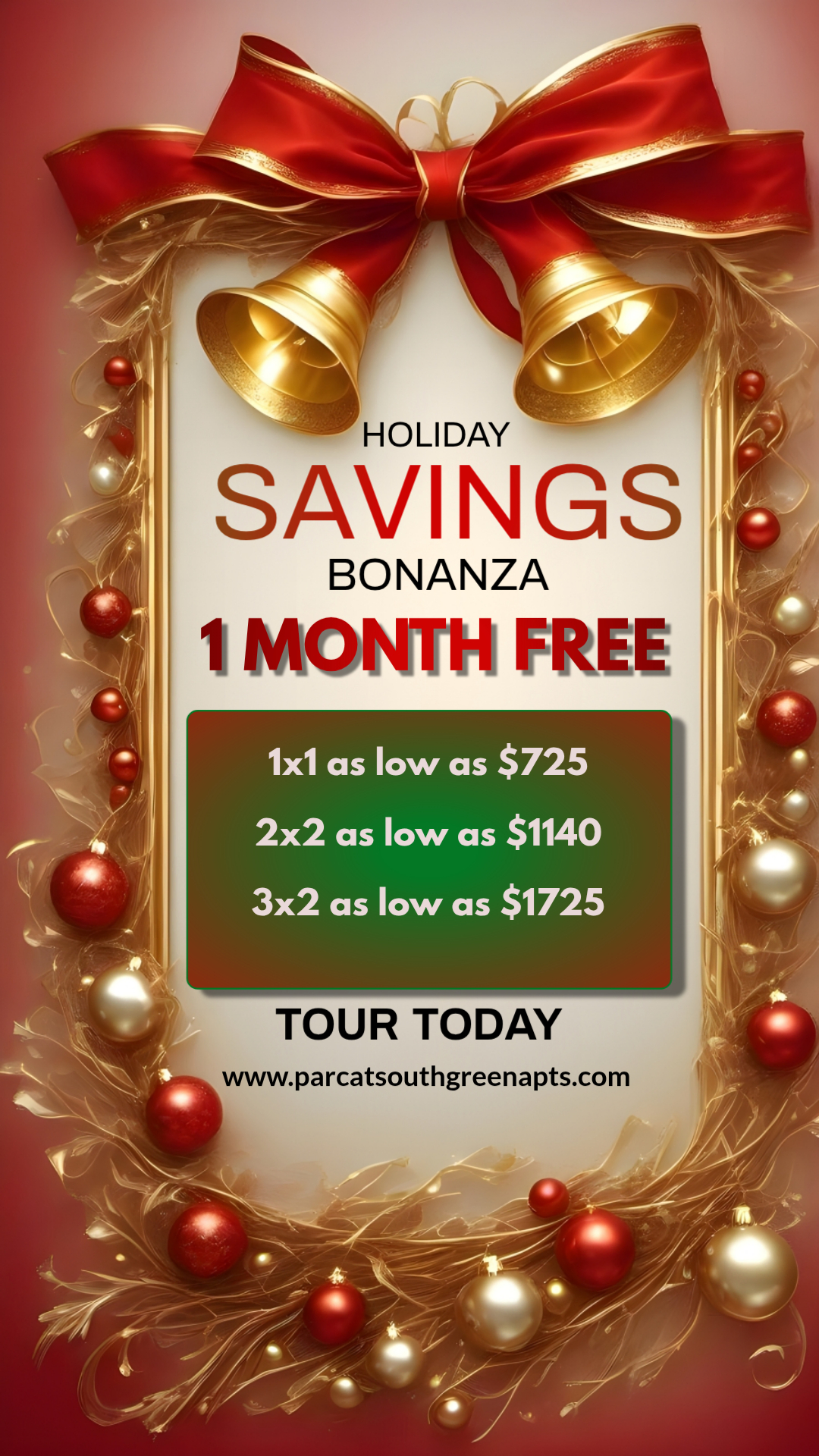 🎄✨ HOLIDAY SAVINGS BONANZA IS HERE! ✨🎄 🔔 1 MONTH FREE on select apartment homes! 🎁 Unwrap unbeatable rates this season: • 1x1 starting as low as $725 • 2x2 starting as low as $1140 • 3x2 starting as low as $1725 🏡 Come tour today and find the perfect home just in time for the holidays! ❤️ Limited-time offer — don’t miss out!